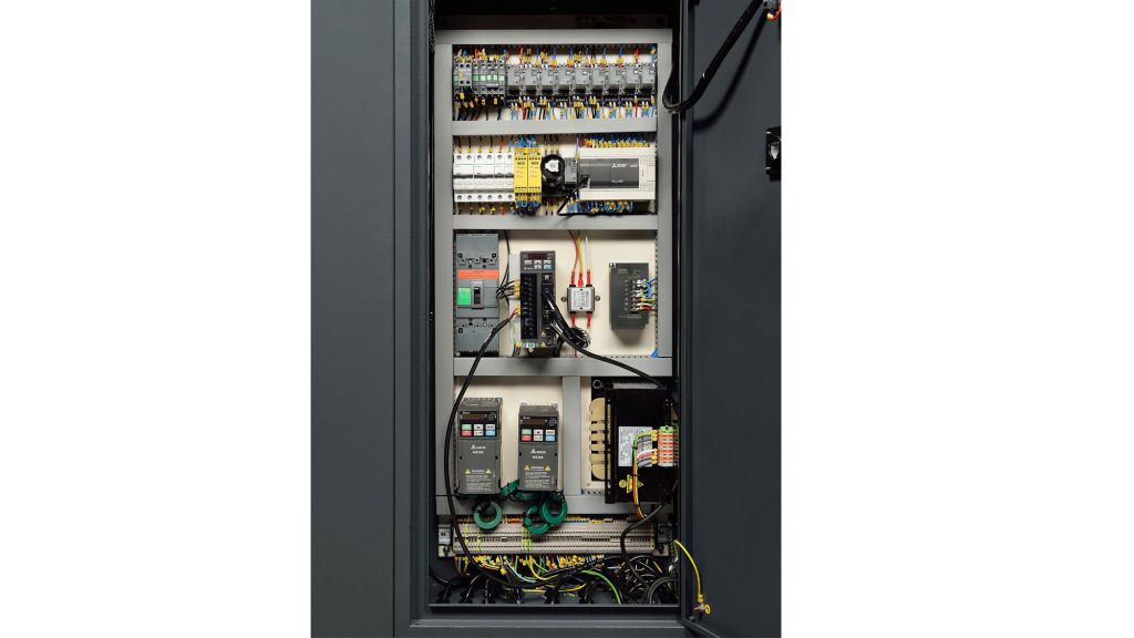The adjustment of material thickness is motorised and adjusted by the built-in touch screen controller.
