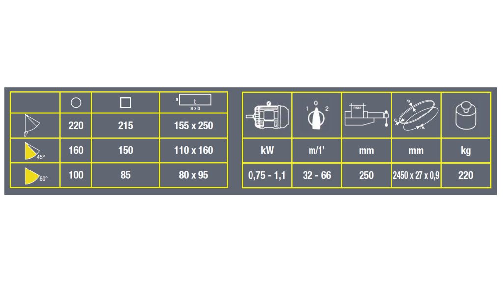 Diameter capacity (90º) 220mm Round / 215mm Square
